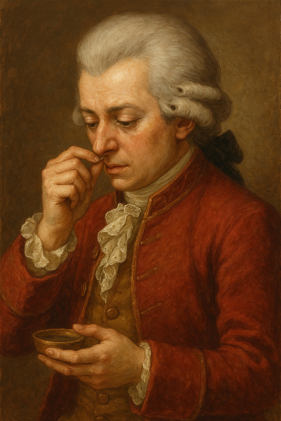 Como todos sabem rapé em Alemão é Schnupftabak! Embora o retrato popular de Mozart como um extrovertido com TDAH e uma queda por muito champanhe e rapé seja frequentemente exagerado, isso não significa que não haja alguma verdade nisso.