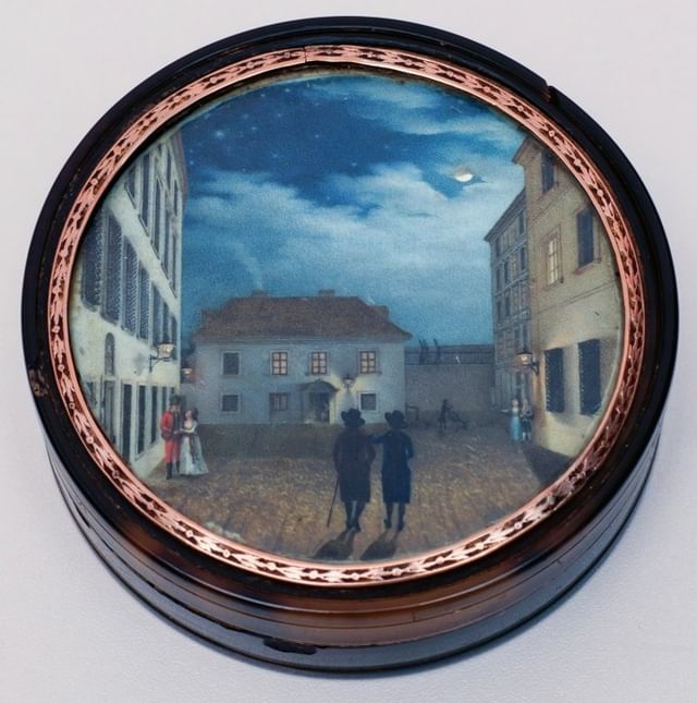 Por fim, gostaria de trazer essa bela imagem, essa era a caixa de rapé utilizada por Mozart, ou talvez uma única que chegou aos nosso dias como legado e testemunho dessa época da história. A pintura na tampa retrata ao que tudo indica a rua da casa de Mozart à noite, um cena bucólica que remete muito as cenas noturnas da opera Don Giovanni...
